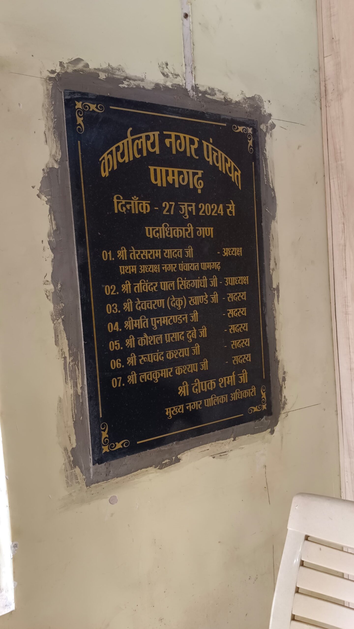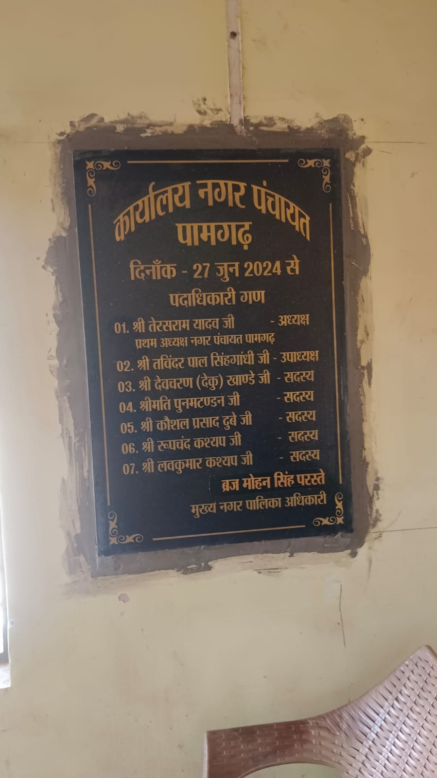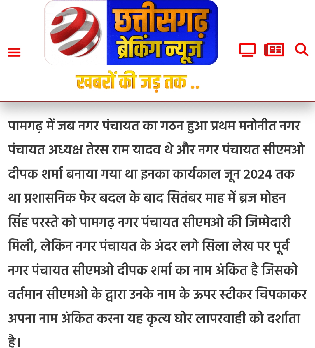 पामगढ़ में जब नगर पंचायत का गठन हुआ प्रथम मनोनीत नगर पंचायत अध्यक्ष तेरस राम यादव थे. और नगर पंचायत सीएमओ दीपक शर्मा बनाया गया था इनका कार्यकाल जून 2024 तक था प्रशासनिक फेर बदल के बाद सितंबर माह में ब्रज मोहन सिंह परस्ते को पामगढ़ नगर पंचायत सीएमओ की जिम्मेदारी मिली, लेकिन नगर पंचायत के अंदर लगे सिला लेख पर पूर्व नगर पंचायत सीएमओ दीपक शर्मा का नाम अंकित है. जिसको वर्तमान सीएमओ के द्वारा उनके नाम के ऊपर स्टीकर चिपकाकर अपना नाम अंकित करना यह कृत्य घोर लापरवाही को दर्शाता है करके इस खबर को छत्तीसगढ़ ब्रेकिंग न्यूज़ में प्रमुखता से उठाया था. मामले की गंभीरता को देखते हुए आज पामगढ़ नगर पंचायत के सीएमओ ने अपना नाम का स्टीकर को निकलवा दिया ।