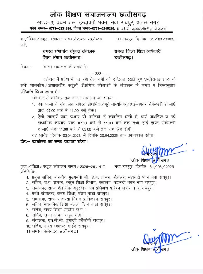 रायपुर। गर्मी के बढ़ते प्रभाव को ध्यान में रखते हुए छत्तीसगढ़ लोक शिक्षण संचालनालय ने राज्य के सभी शासकीय और अशासकीय विद्यालयों के संचालन समय में बदलाव किया है। इस संबंध में आदेश जारी कर दिया गया है।