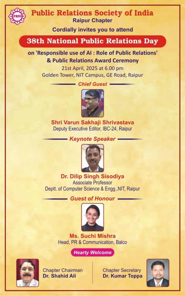 रायपुर । देश भर में मनाए जा रहे राष्ट्रीय जनसंपर्क दिवस 21 अप्रैल के अवसर पर पब्लिक रिलेशन्स सोसाइटी आफ इंडिया रायपुर चैप्टर भी भव्य आयोजन करने जा रहा है। इस मौके पर ‘आर्टिफिशियल इंटेलिजेंस का सकारात्मक उपयोग एवं जनसंपर्क की भूमिका ‘ विषय पर परिचर्चा होगी। कार्यक्रम के मुख्य अतिथि श्री वरुण सखा जी श्रीवास्तव तथा गेस्ट आफ आनर सुश्री शुचि मिश्रा, हेड, पीआर एंड कम्युनिकेशन बालको होंगी। मुख्य वक्तव्य डॉ दिलीप सिंह सिसौदिया, प्रोफेसर, एनआईटी रायपुर के द्वारा दिया जाएगा।