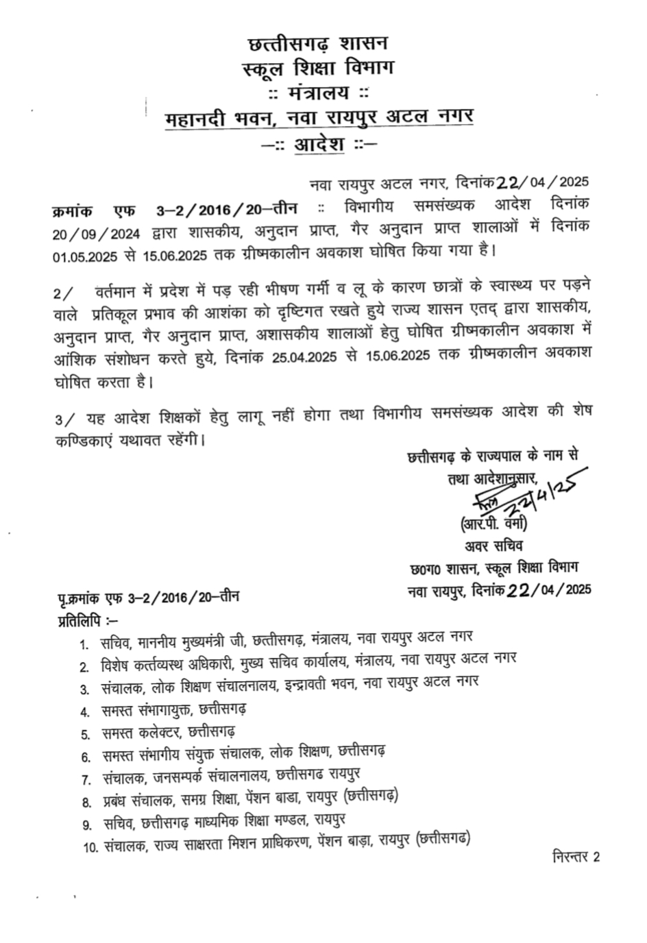 25 अप्रैल से स्कूलों में ग्रीष्मकालीन अवकाश घोषित राज्य शासन ने किया आदेश जारी…