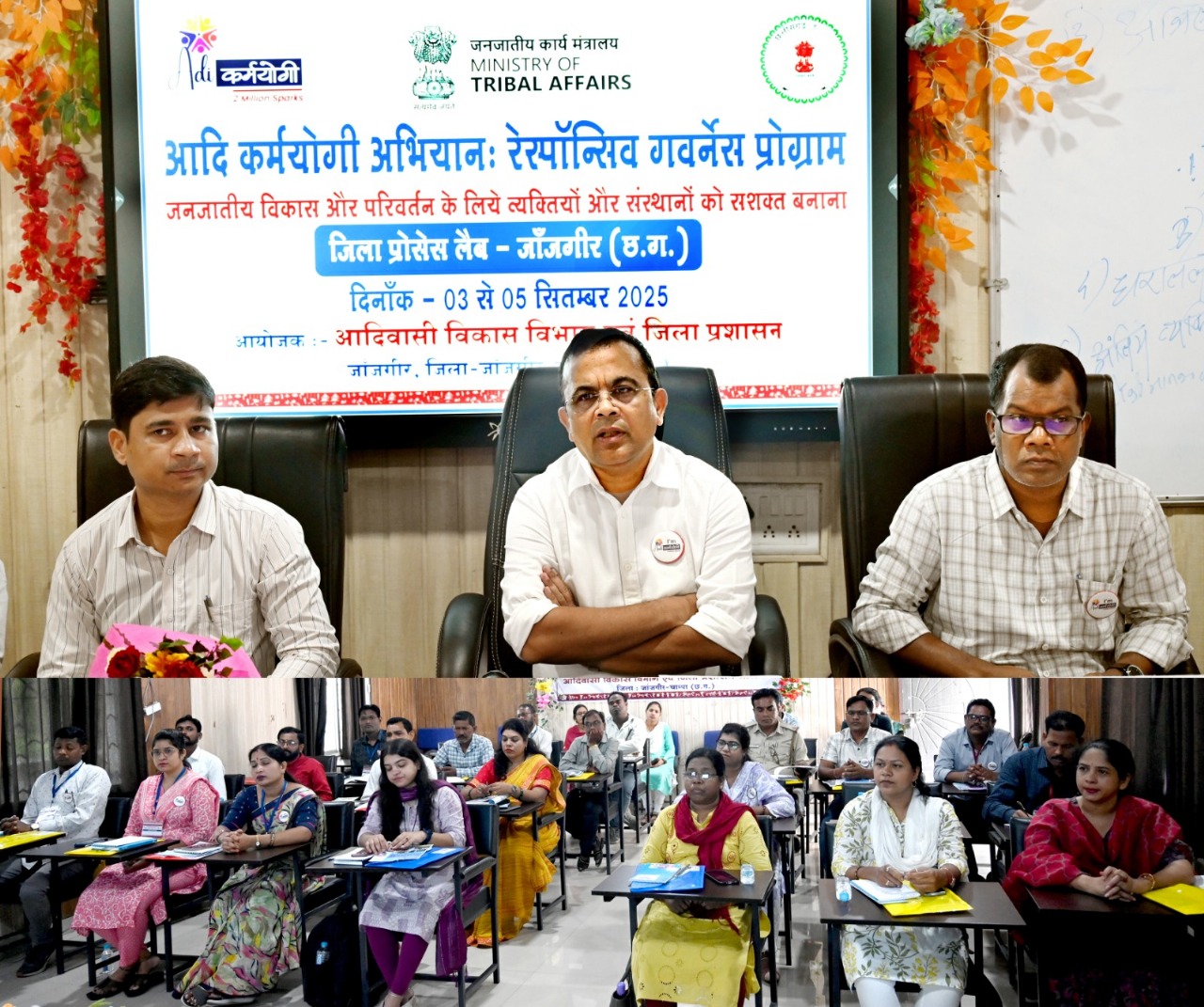 जांजगीर-चांपा, 03 सितम्बर 2025/ जिले में जनजातीय समाज के विकास और सशक्तिकरण हेतु जिला प्रशासन एवं आदिवासी विकास विभाग द्वारा आदि कर्मयोगी अभियान रेस्पॉन्सिव गवर्नेंस प्रशिक्षण कार्यक्रम का आयोजन जिला पंचायत के डीपीआरसी भवन में ब्लॉक मास्टर ट्रेनर्स का तीन दिवसीय आवासीय प्रशिक्षण 03 से 05 सितम्बर 2025 तक का किया जा रहा है। प्रशिक्षण कार्यक्रम का उद्देश्य जनजातीय क्षेत्र में विकास एवं परिवर्तन के लिए व्यक्तियों और संस्थाओं को सशक्त बनाना है।