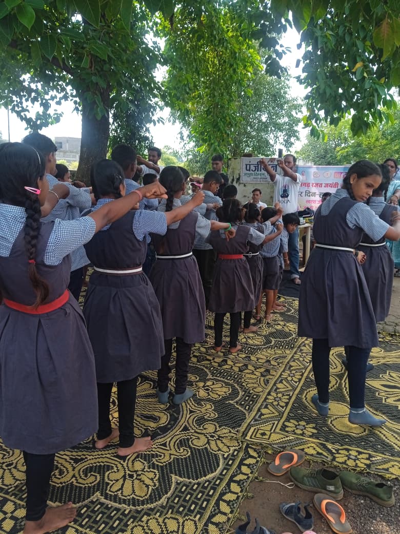 योग प्रशिक्षको द्वारा योग आसन कराया गया,