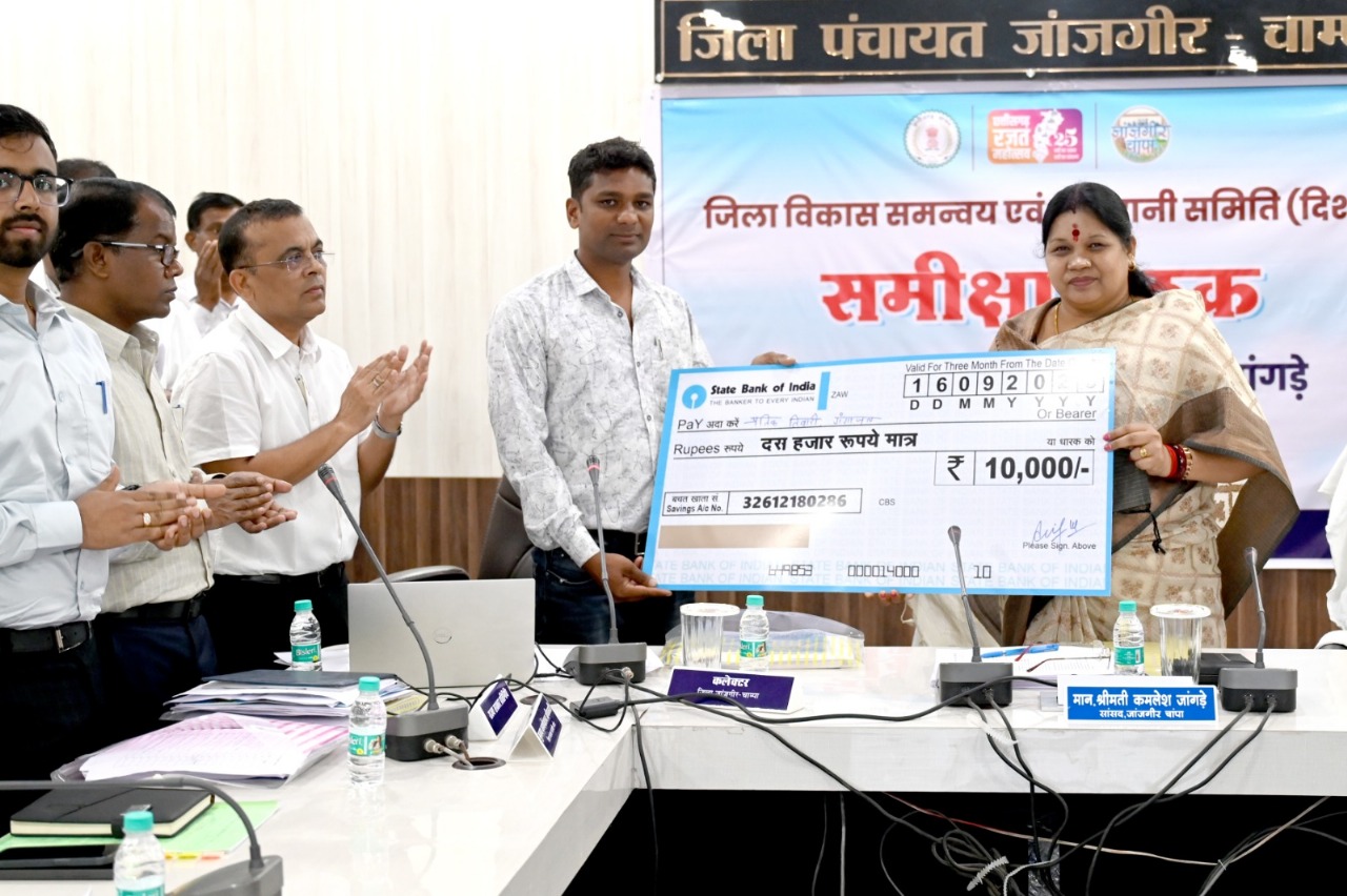 जांजगीर चांपा 16 सितम्बर 2025/ लोकसभा क्षेत्र जांजगीर-चांपा सांसद श्रीमती कमलेश जांगड़े की अध्यक्षता में जिला विकास समन्वय एवं निगरानी समिति (दिशा) की बैठक जिला पंचायत सभाकक्ष में आयोजित हुई। उन्होंने बैठक में केंद्र प्रवर्तित योजनाओं के क्रियान्वयन की गहन समीक्षा की और बेहतर कार्यान्वयन के लिए अधिकारियों को आवश्यक दिशा-निर्देश दिए। सांसद श्रीमती जांगड़े ने दिशा समिति की बैठक में योजनाओं की प्रगति पर बिंदुवार चर्चा की और अधिकारियों से जानकारी ली। इस दौरान सांसद ने हितग्राहियों को जनसंपर्क अनुदान राशि का चेक वितरण किया। इस दौरान दिशा समिति के सदस्यगण विधायक जांजगीर चांपा श्री ब्यास कश्यप, अकलतरा विधायक श्री राघवेंद्र कुमार सिंह, जिला पंचायत अध्यक्ष श्रीमती सत्यलता आनंद मिरी, नगर पालिका परिषद अध्यक्ष श्रीमती रेखा देवा गढ़ेवाल, सर्व नगर पालिका अध्यक्ष, नगर पंचायत अध्यक्ष, जनपद पंचायत अध्यक्ष, सरपंच, श्री गुलजार सिंह, श्री संजय रामचन्द्र अग्रवाल, कलेक्टर श्री जन्मेजय महोबे, वनमण्डलाधिकारी श्री हिमांशु डोंगरे, जिला पंचायत सीईओ श्री गोकुल रावटे, उप संचालक पंचायत श्री अभिमन्यु साहू, सहित विभागीय अधिकारी उपस्थित रहे।