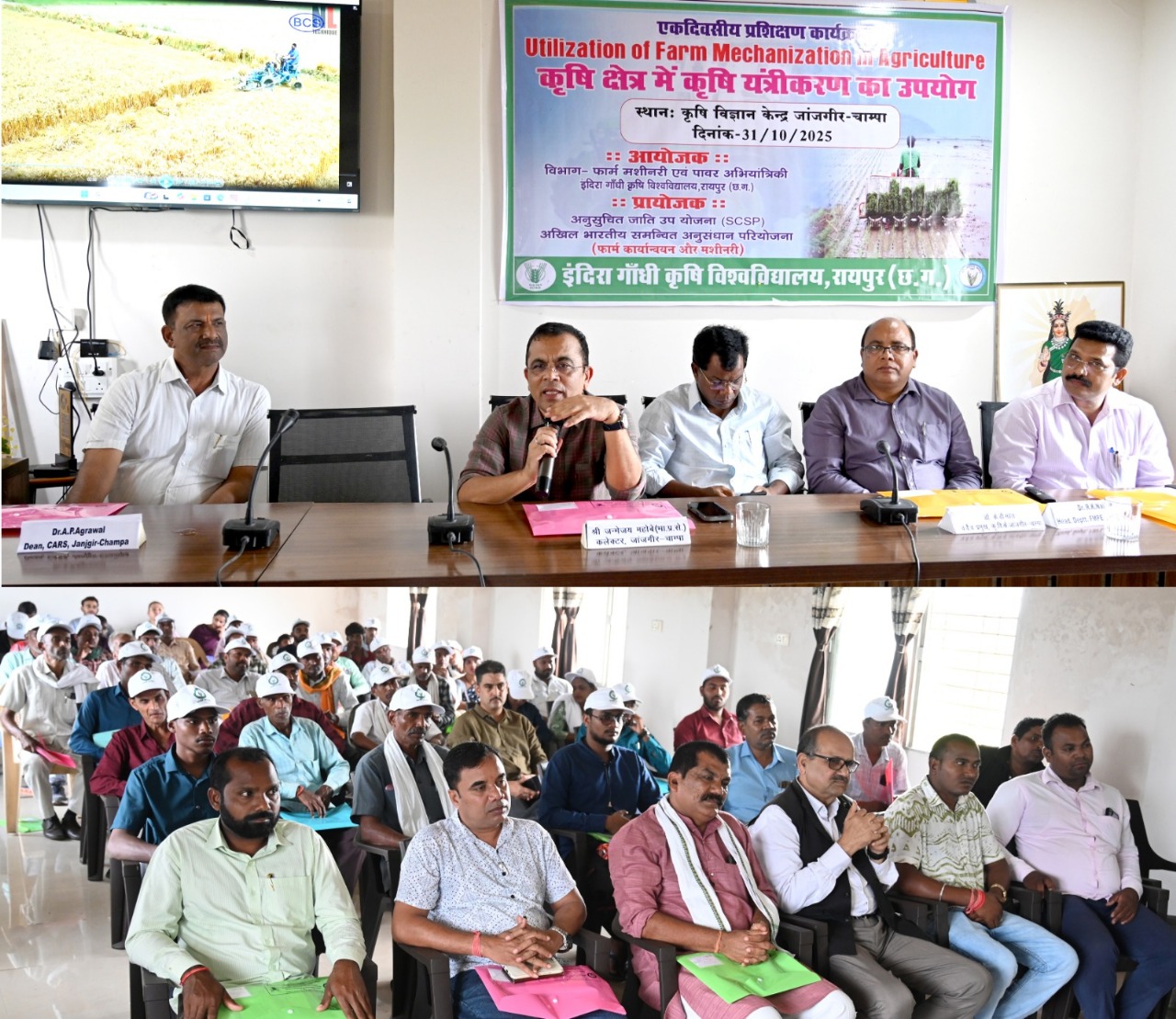 जांजगीर-चांपा 31 अक्टूबर 2025/ कृषि क्षेत्र में यंत्रीकरण के बढ़ते उपयोग और किसानों की आय में वृद्धि को ध्यान में रखते हुए कृषि विज्ञान केन्द्र जांजगीर-चांपा में कृषि क्षेत्र में कृषि यंत्रीकरण का उपयोग विषय पर एकदिवसीय प्रशिक्षण कार्यक्रम का आयोजन किया गया। कार्यक्रम में कलेक्टर श्री जन्मेजय महोबे ने किसानों से सीधे संवाद किया। इस कार्यक्रम का आयोजन विभाग फार्म मशीनरी एवं पावर अभियांत्रिकी, इंदिरा गाँधी कृषि विश्वविद्यालय रायपुर (छत्तीसगढ़) द्वारा किया गया तथा इसका प्रायोजन अनुसूचित जाति उप योजना एवं अखिल भारतीय समन्वित अनुसंधान परियोजना फार्म कार्यान्वयन एवं मशीनरी, इंदिरा गाँधी कृषि विश्वविद्यालय रायपुर द्वारा किया गया। इस अवसर पर जिला पंचायत सीईओ श्री गोकुल कुमार रावटे, उप संचालक कृषि श्री ललित मोहन भगत, सहायक संचालक उद्यानिकी श्रीमती रंजना माखिजा, वरिष्ट वैज्ञानिक डॉ के डी महंत, डॉ आर के नायक, अधिष्ठाता डॉ ए पी अग्रवाल सहित संबंधित अधिकारी कर्मचारी उपस्थित थे।