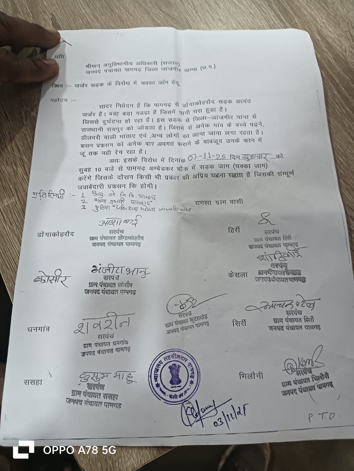 पामगढ़ ब्लॉक के डोंगाकोहरौद जर्जर सड़क निर्माण को लेकर ग्रामीणों ने 7 नवंबर को चक्का जाम करने के लिए एसडीएम को दिया ज्ञापन
