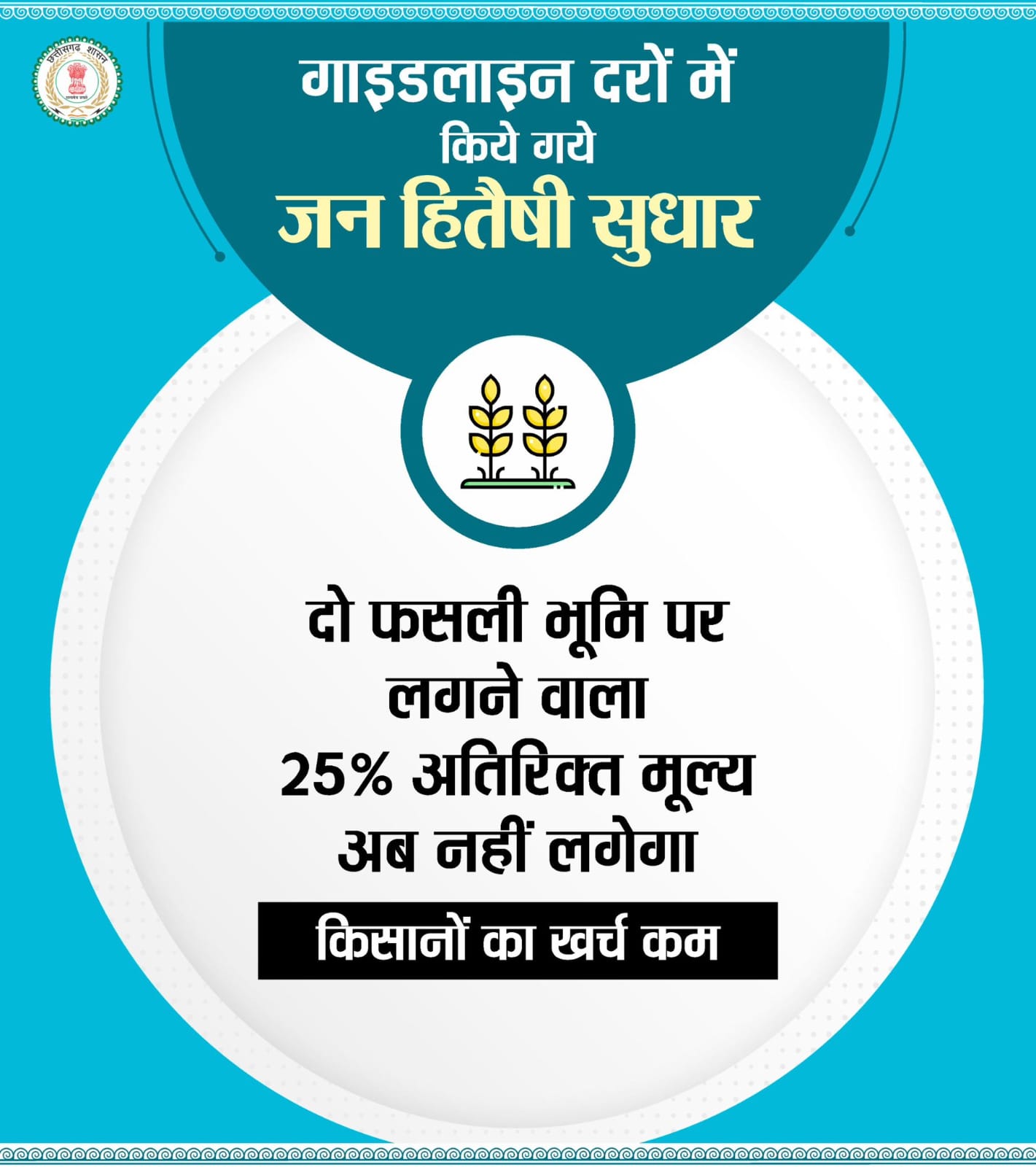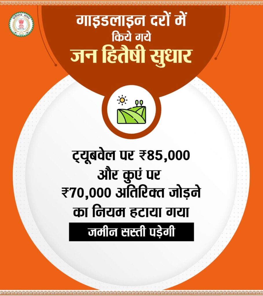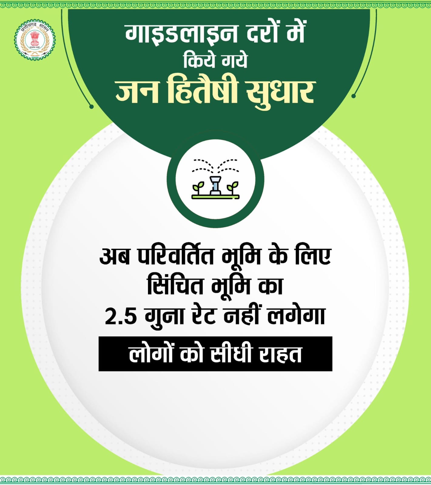 ग्रामीण क्षेत्र हेतु – ग्रामीण क्षेत्रों में मुख्यमार्ग तथा अन्य मार्ग में स्थित एक समान प्रकार भूमि के दरों में असमानता होने के कारण मुख्यमार्ग तथा अन्यमार्ग के आमने-सामने के दरों में समानता रखी गई है। ग्रामों का समूहीकरण कर समान महत्व वाले ग्रामों को वर्गीकृत किया जाकर, प्रत्येक समान वर्ग के ग्रामों के लिए एक समान दर निर्धारित करने का प्रयास किया गया है। तथा ग्रामों से होकर गुजरने वाली सड़कों के दोनों ओर स्थित ग्रामों के दर में समानता रखी गई है। ग्रामीण क्षेत्रों में वर्गमीटर दर को समाप्त कर, प्रत्येक ग्राम में केवल स्वीकृत अभिविन्यास हेतु पृथक से प्रति वर्ग मीटर की दर निर्धारित की गई है। किसानों एवं आम जनता को उनके संपत्ति (भूमि) के वास्तविक मूल्य अनुसार लाभ प्राप्त हो, बाजार मूल्य दरों को संतुलित करने हेतु तथा नई गाइडलाइन दर में जनहितैषी युक्तियुक्त करण/संशोधन कर, लागू की गई है। जो कि किसानों तथा आम जनता के हितकर साबित होगी।