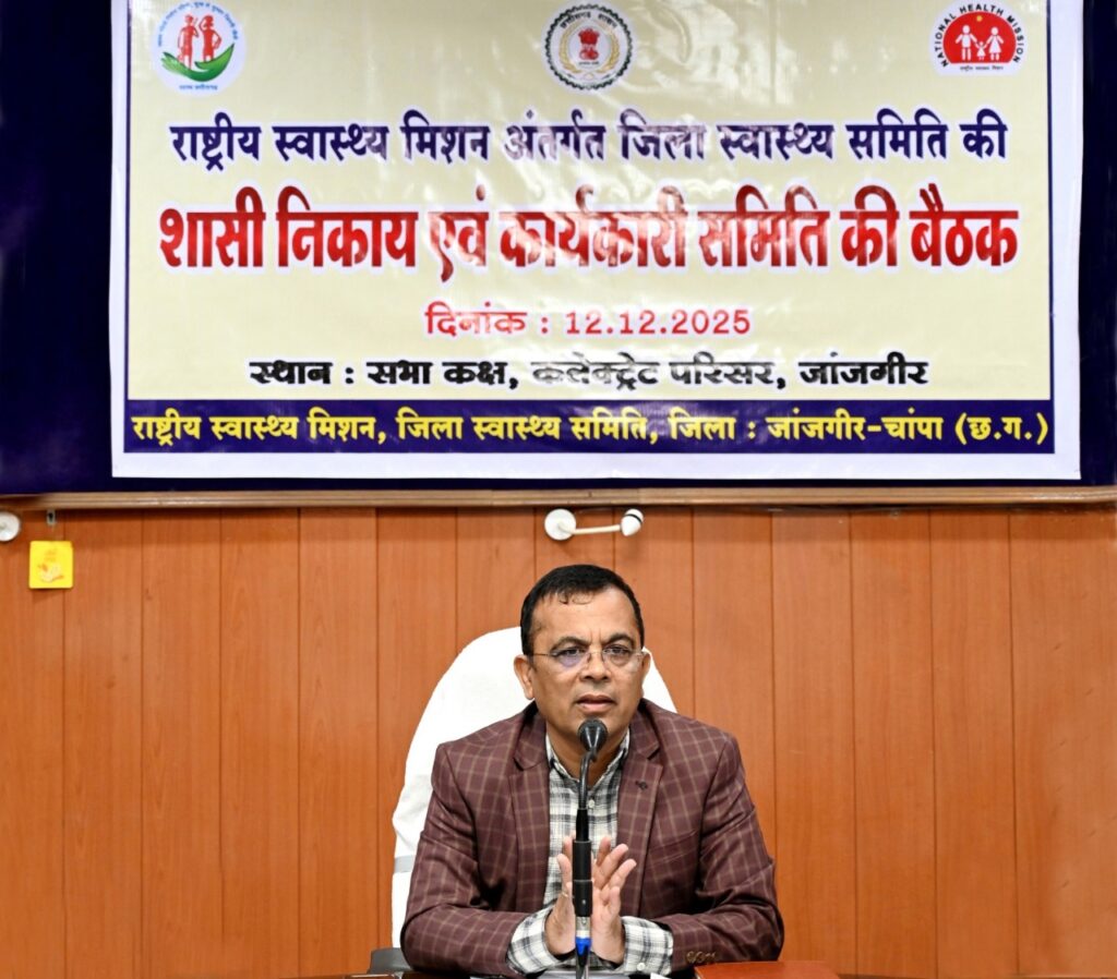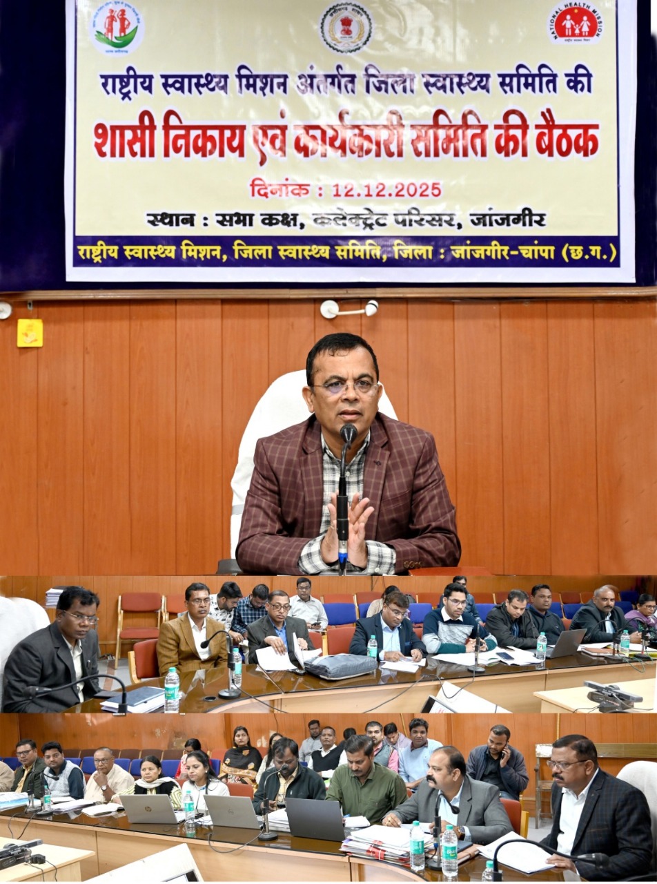 जांजगीर-चांपा, 12 दिसम्बर 2025/ कलेक्टर  जन्मेजय महोबे की अध्यक्षता में राष्ट्रीय स्वास्थ्य मिशन अंतर्गत जिला स्वास्थ्य समिति की शासी एवं कार्यकारी समिति की बैठक कलेक्टोरेट सभाकक्ष में सम्पन्न हुई। बैठक में जिले में संचालित स्वास्थ्य योजनाओं, टीकाकरण कार्यक्रम, मातृ-शिशु स्वास्थ्य सेवाओं, कुपोषण उन्मूलन, स्वास्थ्य संस्थाओं की उपलब्धियों एवं चुनौतियों तथा आगामी कार्ययोजना पर विस्तृत चर्चा की गई। कलेक्टर श्री महोबे ने सभी जनस्वास्थ्य कार्यक्रमों को प्रभावी ढंग से क्रियान्वित करने के निर्देश दिए। स्वास्थ्य सेवाओं की गुणवत्ता एवं सतत सुधार विभाग की सर्वाेच्च प्राथमिकता हो।