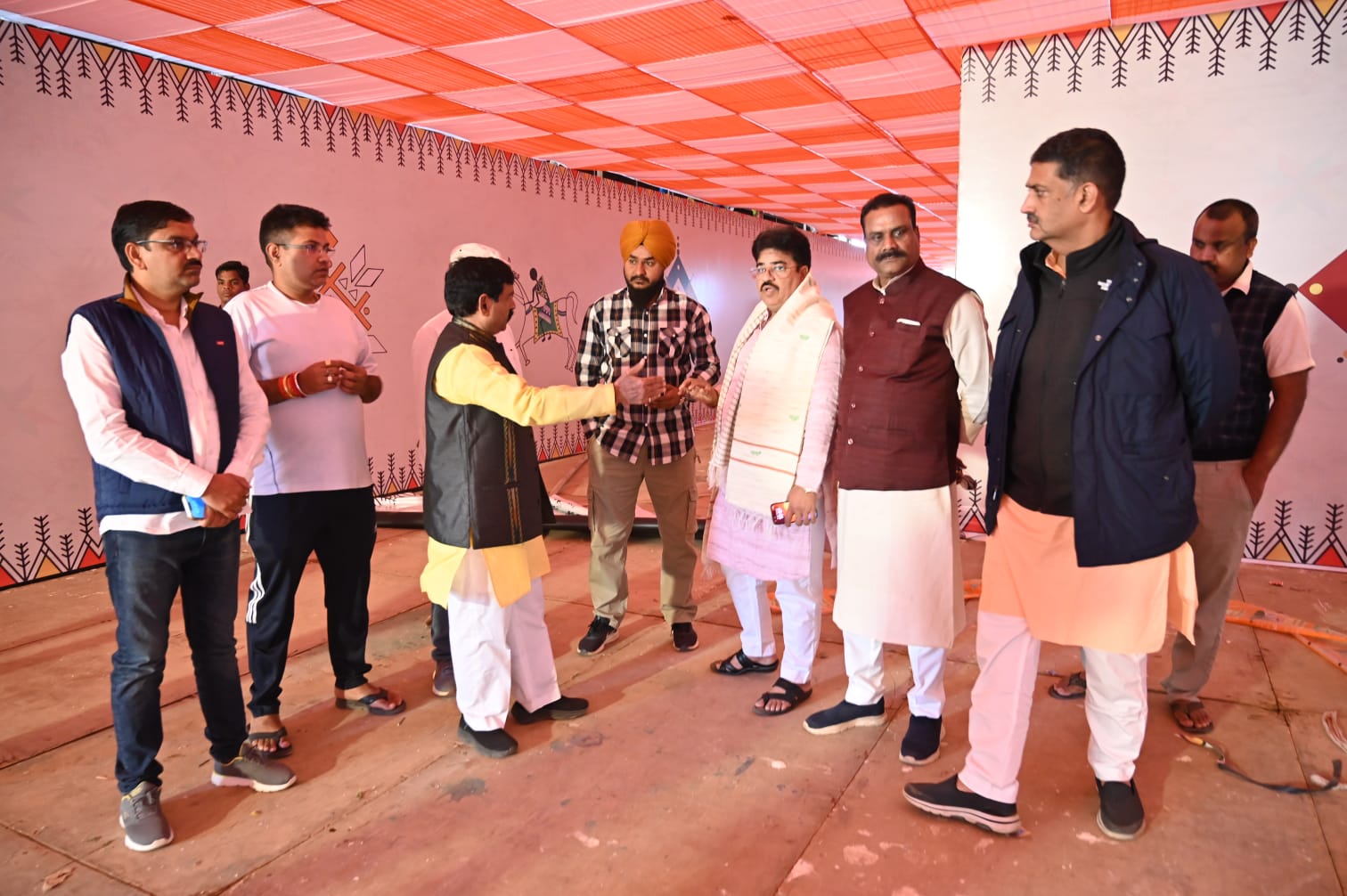 तैयारियों को लेकर आज राज्य खनिज निमग के अध्यक्ष श्री सौरभ सिंह, महापौर धमतरी श्री जगदीश रोहरा, श्री यशवंत जैन, पूर्व संसदीय सचिव श्री अंबेश जांगड़े सहित कलेक्टर श्री जन्मेजय महोबे, पुलिस अधीक्षक श्री विजय कुमार पांडेय ने कार्यक्रम स्थल का निरीक्षण करते हुए तैयांरियों का जायजा लिया एवं संबंधित अधिकारियों को आवश्यक दिशा निर्देश दिए। निरीक्षण के दौरान कार्यक्रम को सुचारु, सुरक्षित और व्यवस्थित तरीके से संपन्न कराने के लिए आवश्यक निर्देश अधिकारियों को दिए। कार्यक्रम के गरिमामय आयोजन को लेकर जिला प्रशासन द्वारा सुरक्षा एवं व्यवस्थाओं के पुख्ता इंतज़ाम किये गये है। इस अवसर पर श्री पुष्पेन्द्र सिंह, श्री कार्तिकेश्वर र्स्वणकार, श्री प्रशांत सिंह, श्री विकास सिंह, श्रीमती उमा सोनी, श्री अंकित अग्रवाल, अतिरिक्त पुलिस अधीक्षक श्री उमेश कश्यप सहित जनप्रतिनिधि, संबंधित अधिकारी-कर्मचारी उपस्थित थे।