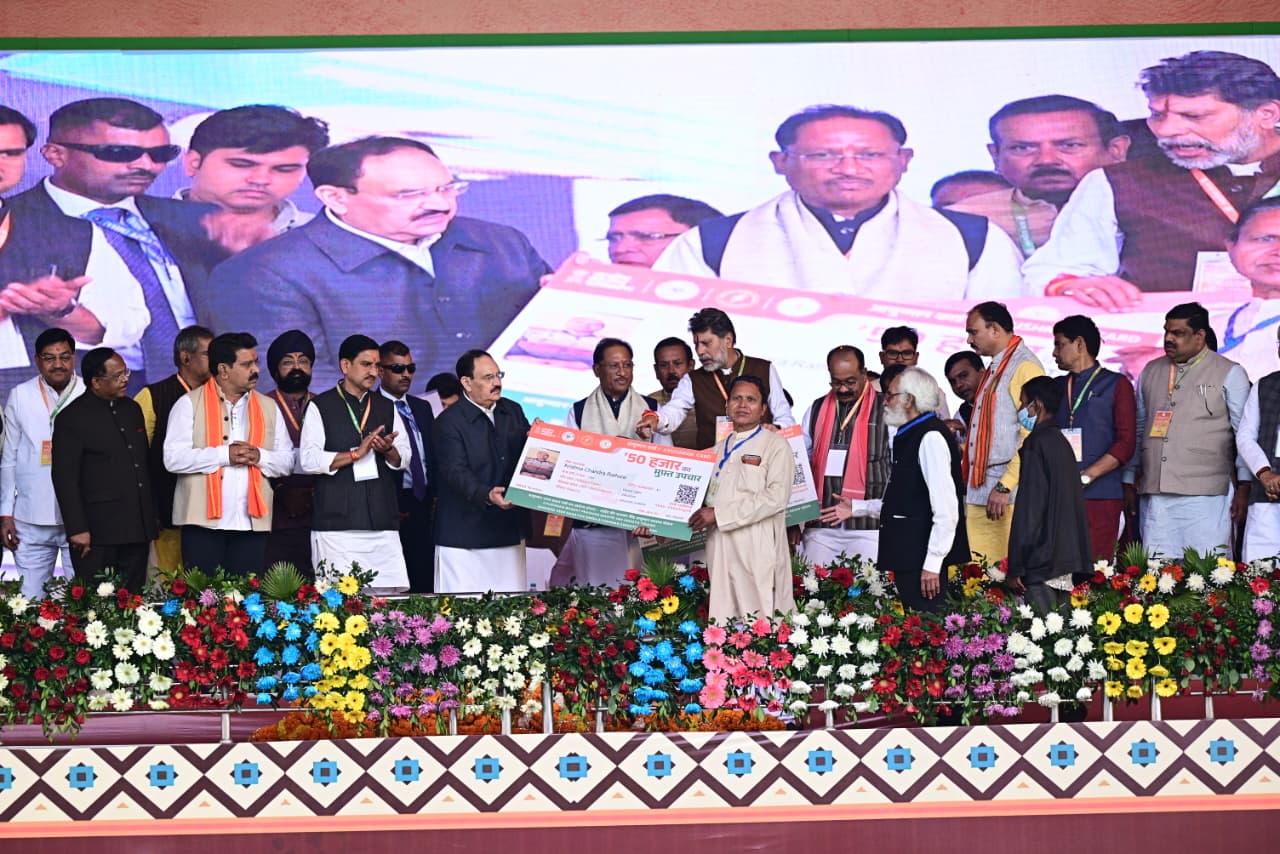 केंद्रीय मंत्री श्री जे पी नड्डा और मुख्यमंत्री श्री विष्णु देव साय ने विभिन्न विभागों की विकासमूलक प्रदर्शनी का अवलोकन किया। कृषि, उद्यानिकी, मत्स्य, शिक्षा, महिला-बाल विकास, जल संसाधन, ऊर्जा, सहकारिता सहित कई स्टॉलों पर योजनाओं की जानकारी ली गई। मुख्यमंत्री श्री साय ने हितग्राहियों से सीधे संवाद कर योजनाओं से जीवन में आए सकारात्मक बदलावों को सुना। कार्यक्रम में पीएम आवास योजनांतर्गत लाभार्थियों को चाबियां सौंपी गईं। इस अवसर पर जनप्रतिनिधियों ने अधिकारियों से योजनाओं के प्रभावी क्रियान्वयन और अंतिम व्यक्ति तक लाभ पहुंचाने का आह्वान किया। इस दौरान कृषि मंत्री श्री राम विचार नेताम, कौशल विकास, तकनीकी शिक्षा एवं रोजगार मंत्री श्री गुरु खुशवंत साहेब, लोकसभा क्षेत्र जांजगीर-चांपा सांसद श्रीमती कमलेश जांगड़े ने जनादेश परब को संबोधित करते हुए विगत 02 वर्ष में मुख्यमंत्री श्री विष्णुदेव साय के नेतृत्व में राज्य निरंतर विकास होने की बात कही।