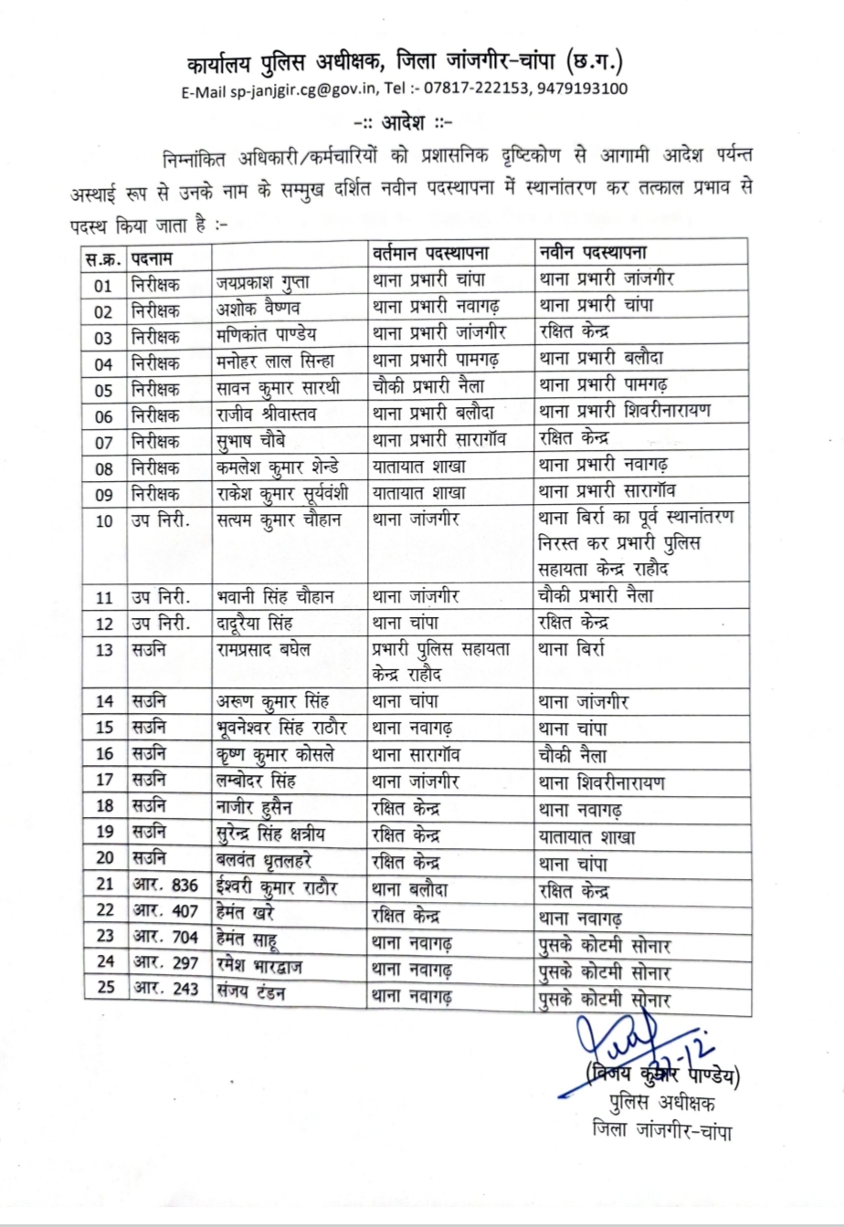 janjgir champa police transfer : जांजगीर-चांपा थाना प्रभारी का ट्रांसफर लिस्ट जारी, देखें किसको कहां मिला प्रभार.